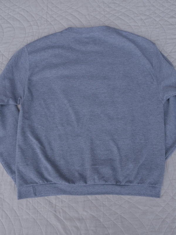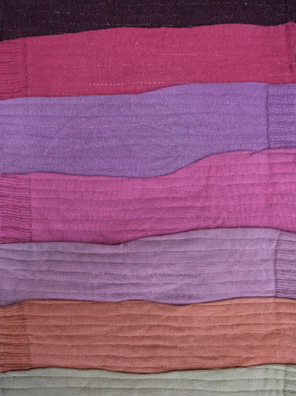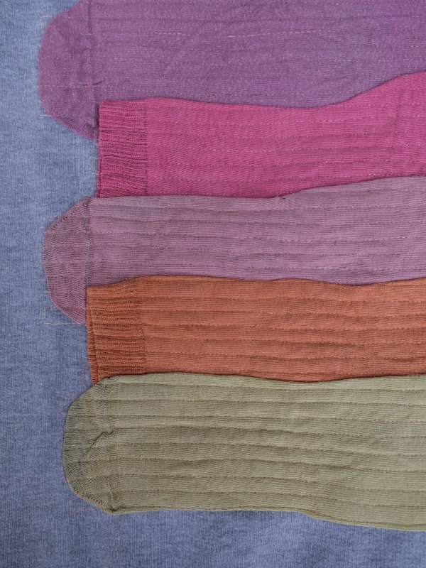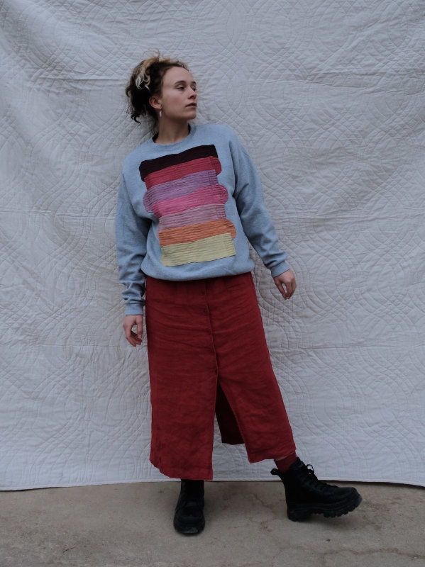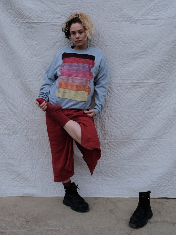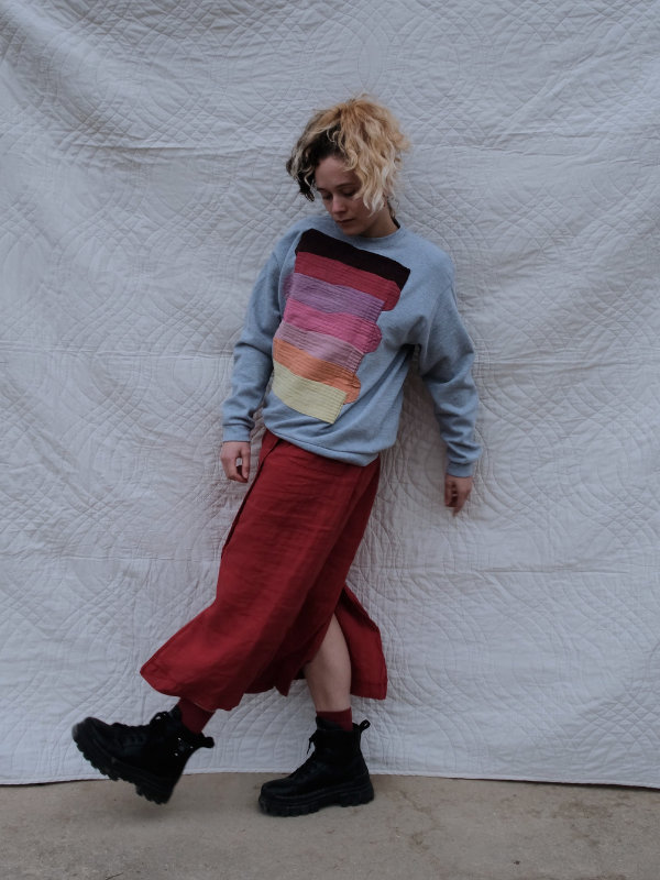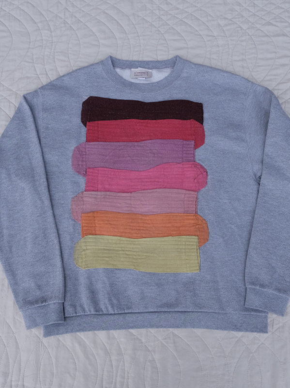 grauer second-hand pullover benäht mit einer collage aus roten, pinken, orangen und gelben socken.