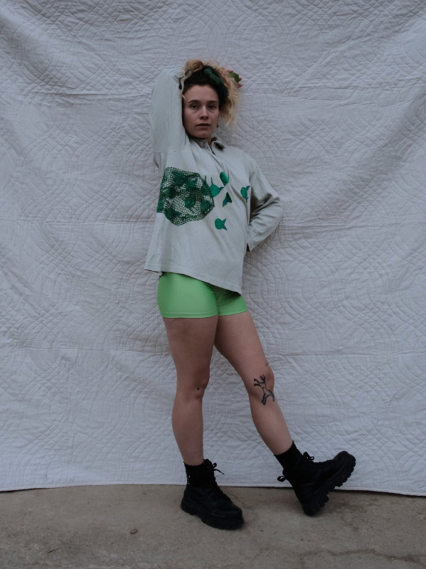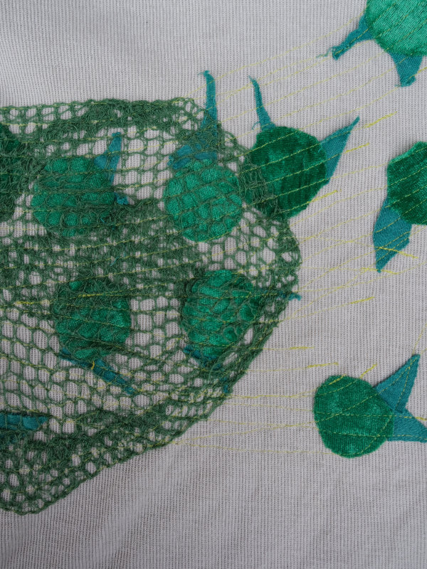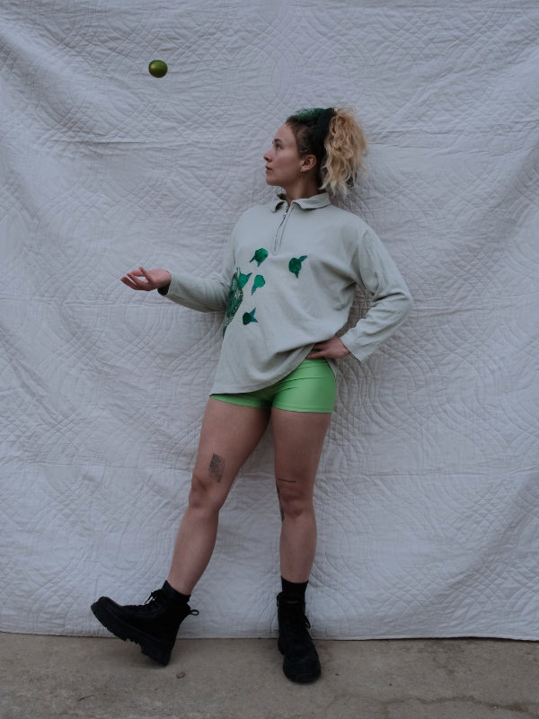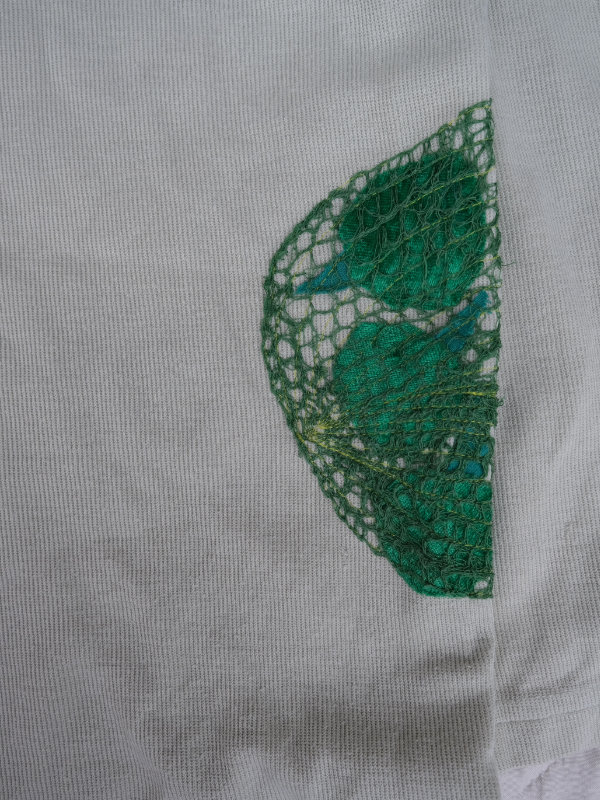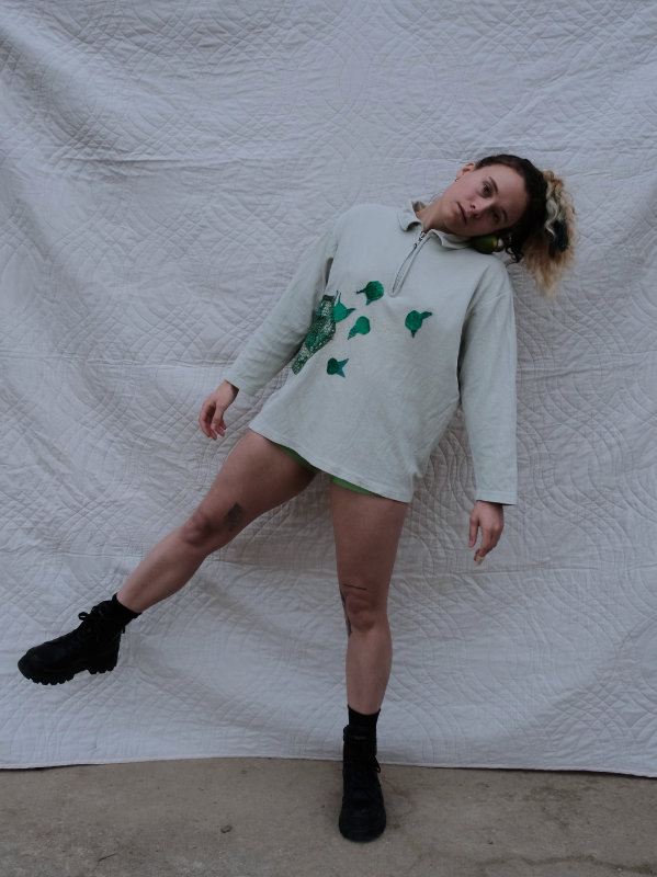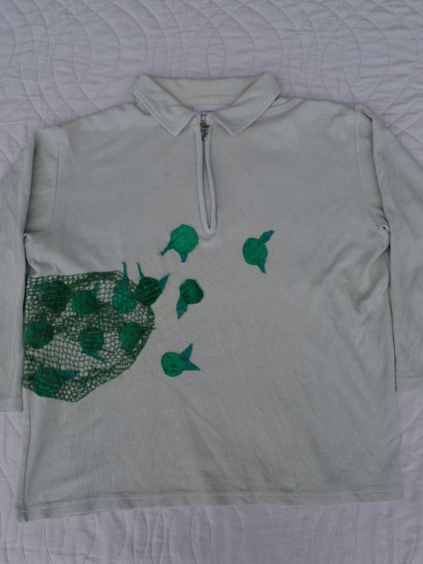 hellgrüner second-hand pullover benäht mit einer collage aus grünen stoffen und obstnetzen in form von limetten.