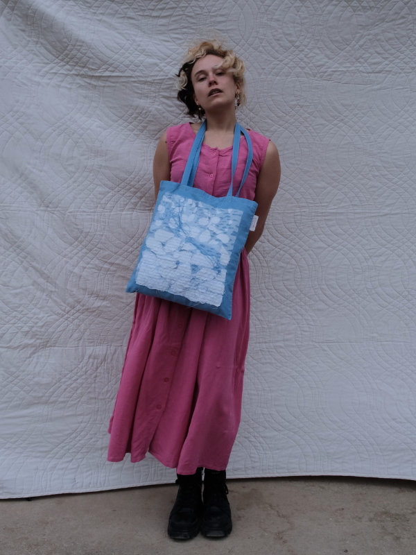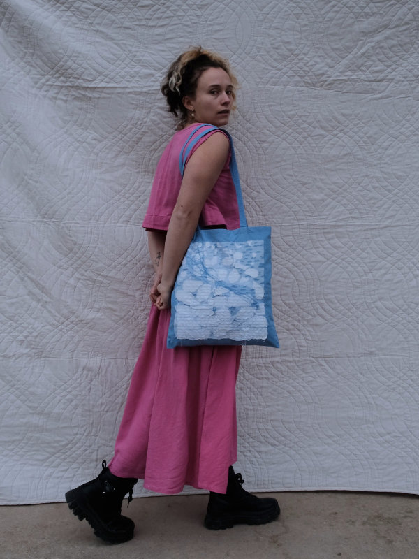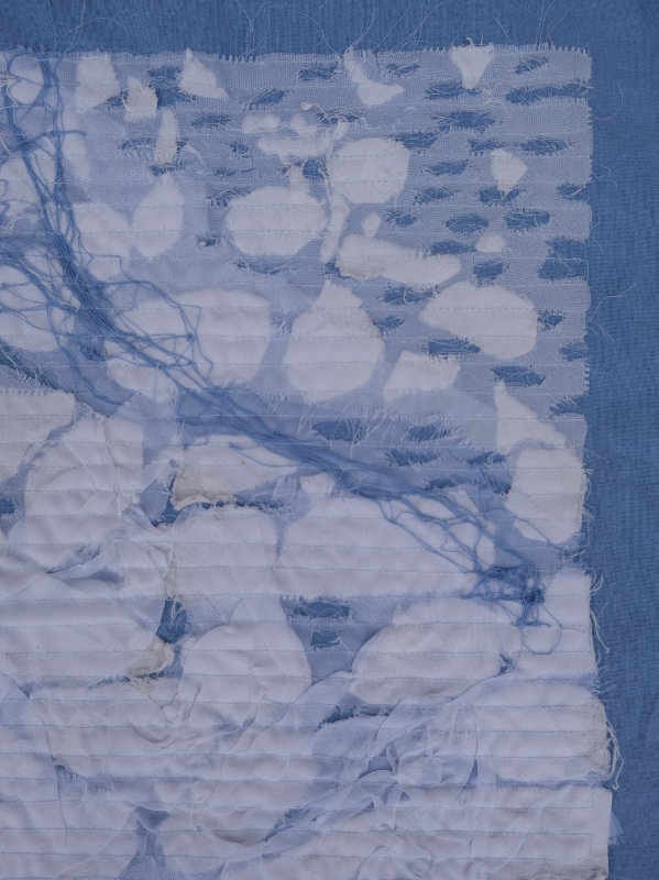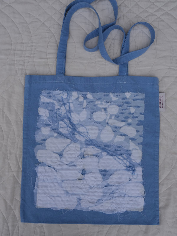 blaue tasche aus second-hand stoff benäht mit einer wolkencollage aus weißen stoffresten.